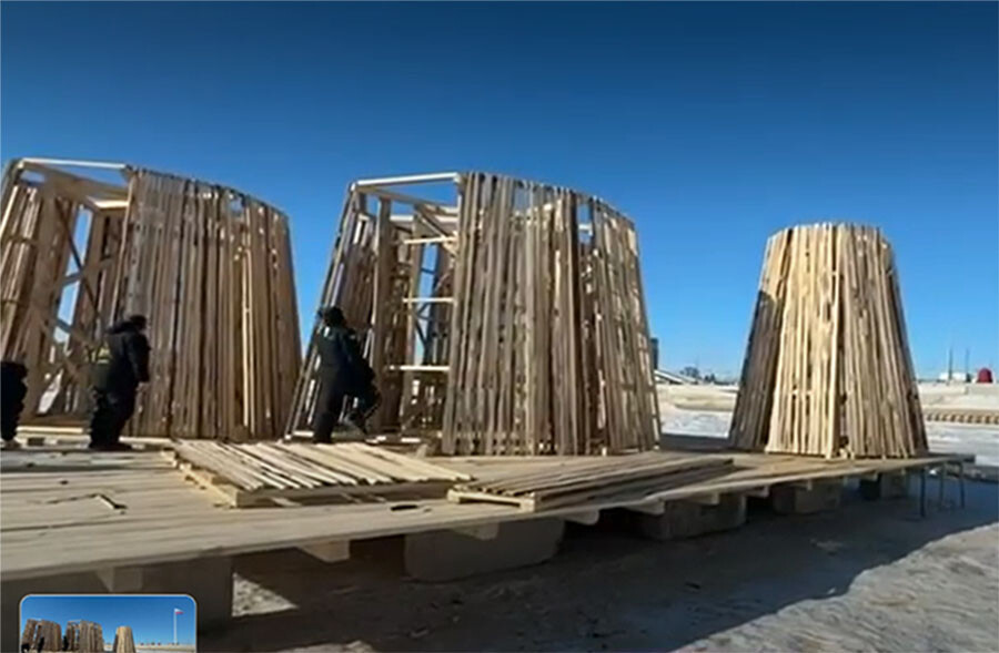 Чтобы пламя не повредило лед, по которому проходит трасса фестиваля зимних видов спорта, под Масленицей установили бетонное основание.