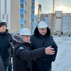 Руководители проверили, как идет строительство жилых домов в микрорайоне «Звездный». В настоящее время там возводится два многоквартирных дома. В каждом по 125 квартир. Один из них практически достроен.