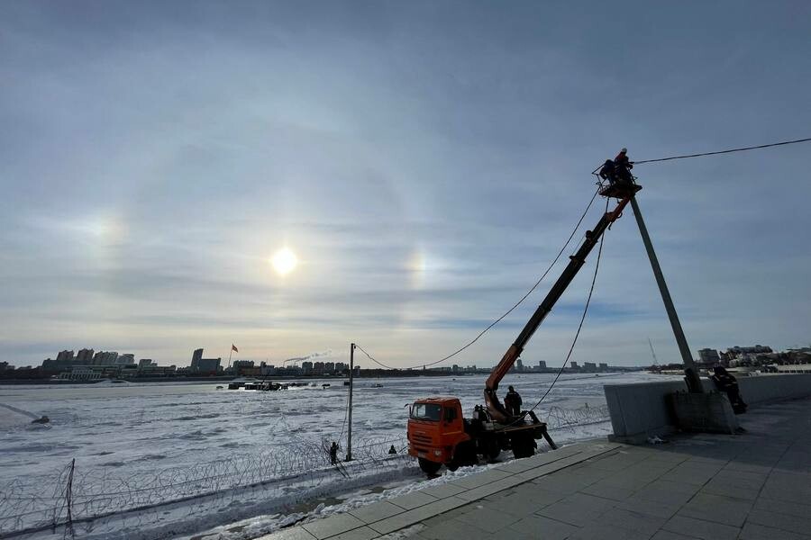 Электрический кабель не было возможности уложить в грунт, поэтому специалисты главного ресурсоснабжающего предприятия Благовещенска установили временные опоры на пограничный лед и протянули сети, сообщает РКС Благовещенск.