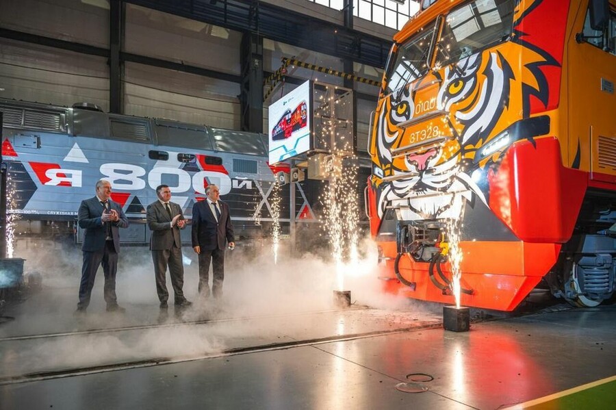 На Брянском машиностроительном заводе прошла торжественная презентация магистральных грузовых тепловозов с юбилейными номерами. Один из них, 3ТЭ28–100, в ливрее, имитирующей окрас амурского тигра, будет работать в депо города Тында Дальневосточной железной дороги.