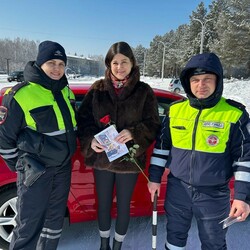 Они останавливали транспортные средства, за рулём которых находились представительницы прекрасного пола. И вместо привычного требования предъявить документы, они вручали цветы и открытки с поздравлениями.