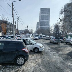 Парковка возле одного из салонов города оказалась не просто забитой, а буквально переполненной. Автомобилисты оставляют свой транспорт прямо вдоль дороги, которая и без этого не очень широкая.
