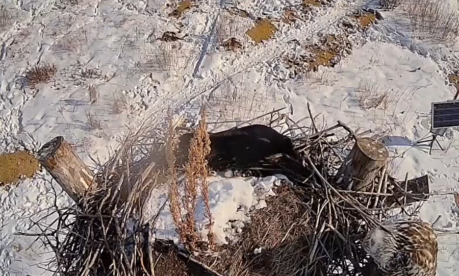 В Муравьевском парке ворона донимала мирно сидящего канюка-зимняка. Черная птица била его палкой.