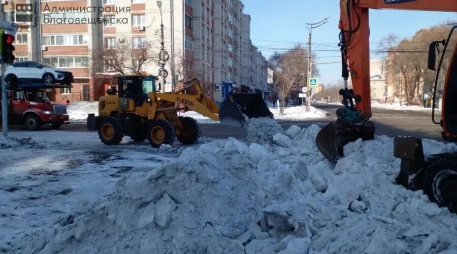 В Благовещенске продолжают ликвидировать последствия обильного мартовского снегопада. В работе задействованы 15 единиц техники ГСТК, 6 единиц привлечённой техники и 12 сотрудников на ручной уборке.