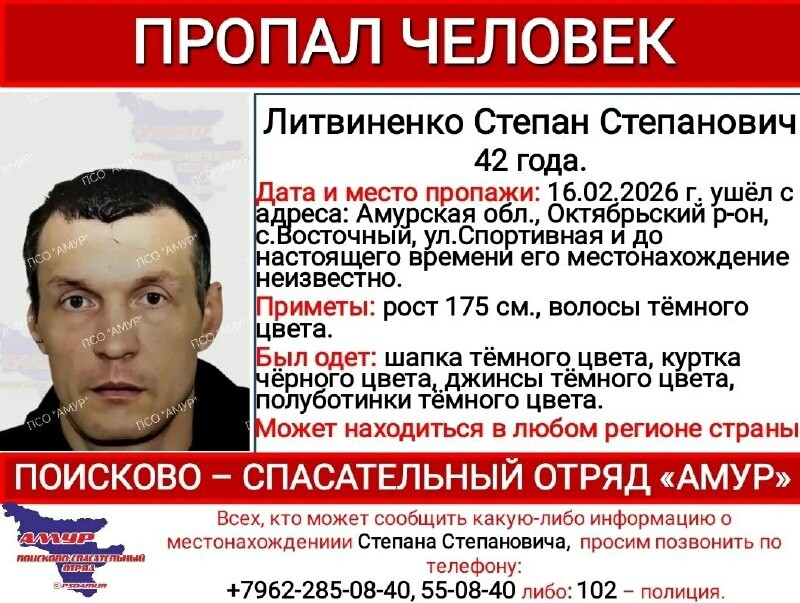 ПСО «Амур» опубликовал ориентировку о розыске 42-летнего Степана Степановича Литвиненко. География поиска стала широкой, так как мужчина направлялся в Новосибирск, но до конечной точки мог не добраться.