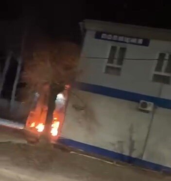 На кадрах видно, как полыхает вход в отделение, а от горящего здания удаляется одетый в черное мужчина. Предварительно, причиной пожара стал поджег.