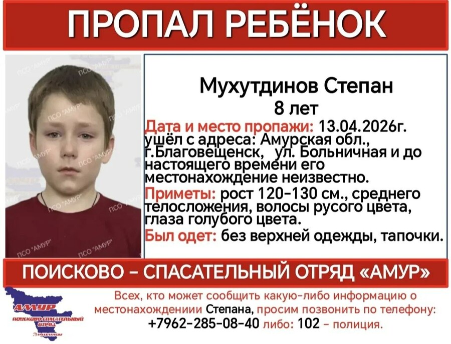 13 апреля в Благовещенске с улицы Больничной ушел 8-летний Степан Мухутдинов. До настоящего времени его местонахождение неизвестно.