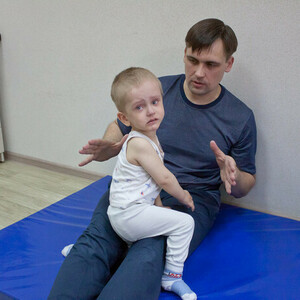 «Мы практически не держали голову, не использовали руку, заваливались на эту сторону сильно. Сейчас он все делает фактически самостоятельно. Ему не больно. Плачут они почти все на занятиях только потому, что я заставляю его делать то, что он не умеет делать, либо не хочет», – рассказывает кинезиотерапевт Сергей Бещетников.