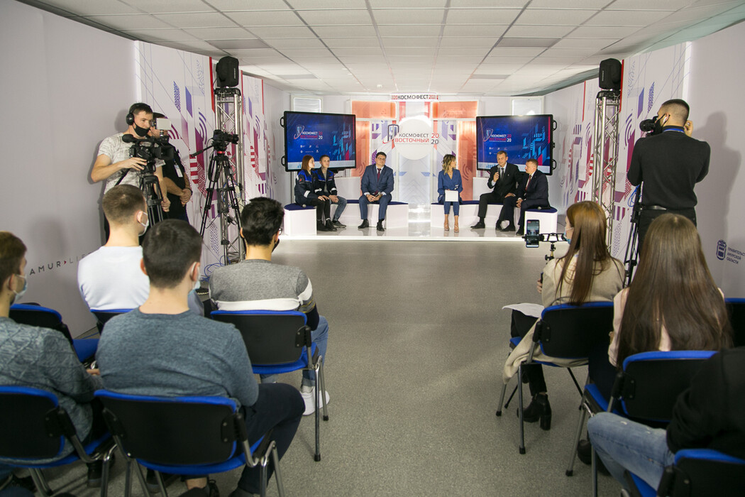 В студии Амурского государственного университета собрались директор филиала АО «ЦЭНКИ» - КЦ «Восточный» Роман Бобков, директор филиала Роскосмоса на космодроме Восточный Сергей Еремин, декан инженерно-физического факультета АмГУ Аркадий Козырь, а также выпускники университета Даниил и Светлана Гамза, которые в настоящее время живут в Циолковском и работают на космодроме Восточный.