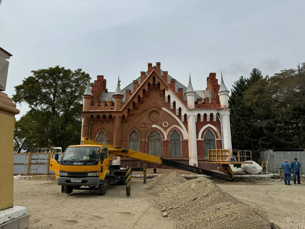Рабочие уже очистили с фасада часть коричневой и белой краски, которой были покрыты кирпичи. Затем кирпичную кладку отмоют и покроют специальным составом, который придаст фасаду водонепроницаемые свойства.